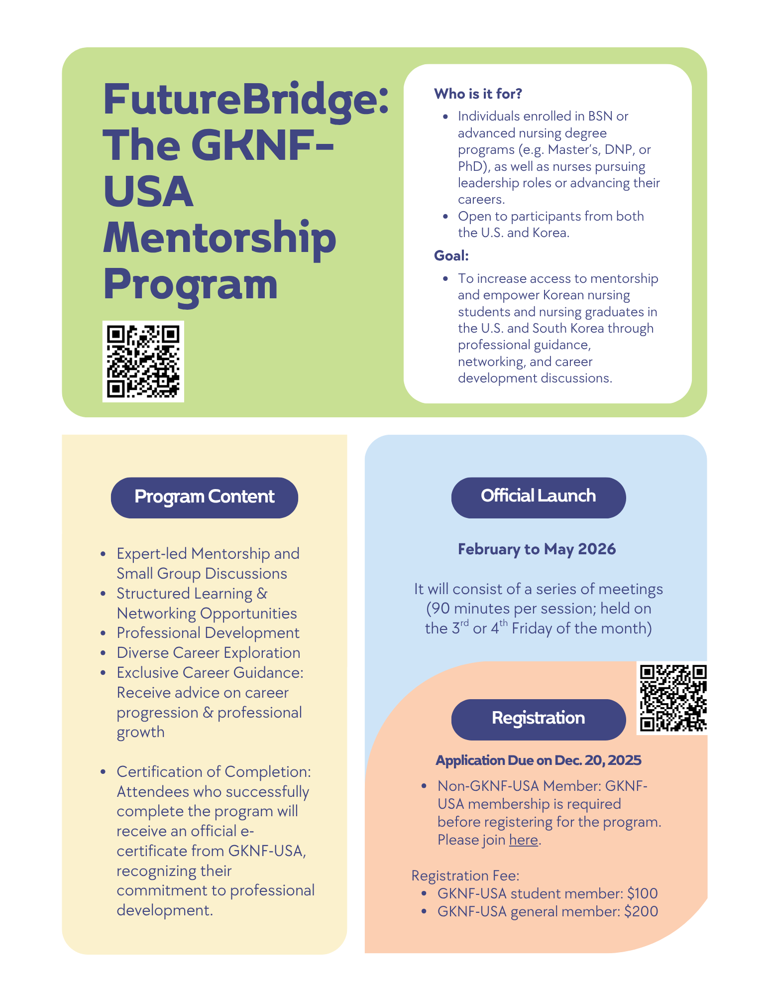 Conferences & Workshops 총 1건 FutureBridge: The GKNF-USA Mentorship Program See below for the link to register and to download a PDF of the flyer. . APPLICATION DOWNLOAD Total 1건 1 페이지 0 공지 FutureBridge: The GKNF-USA Mentorship Program 검색