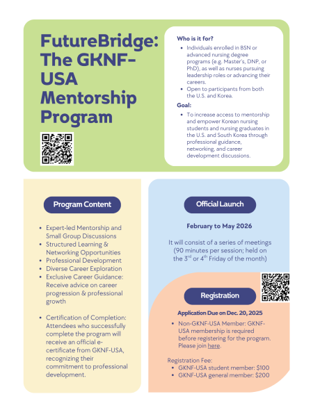 Conferences & Workshops 총 1건 FutureBridge: The GKNF-USA Mentorship Program See below for the link to register and to download a PDF of the flyer. . APPLICATION DOWNLOAD Total 1건 1 페이지 0 공지 FutureBridge: The GKNF-USA Mentorship Program 검색